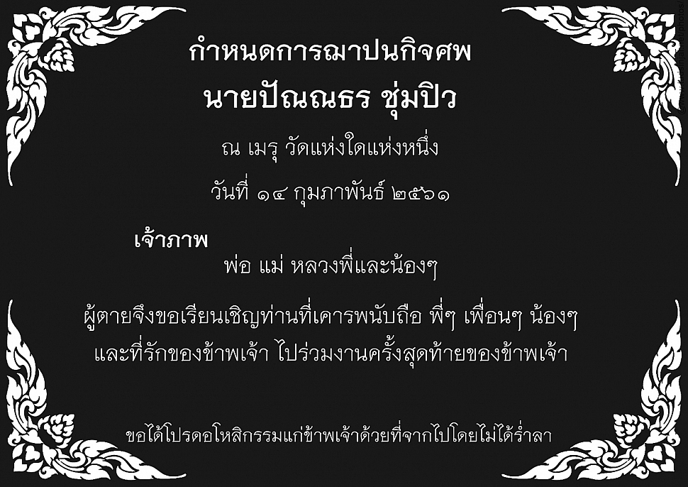 last2018-02-14 ตัวอย่างการ์ดงานศพ Rate this photo:cancel my vote Uploaded by ตัดสินใจ ดอทคอม on January 20, 2018 12:08 Albums: PhotoShare 0 comments Add comment Your name Email Site Comment → Refresh CAPTCHA Ctrl+Enter